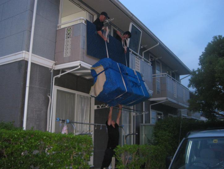 上記画像は、メゾネットタイプのアパートの2階のベランダからクレーンでソファを吊り上げ搬入している画像です。